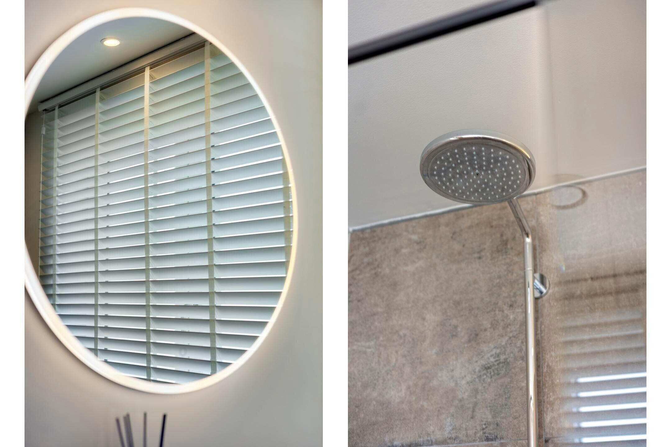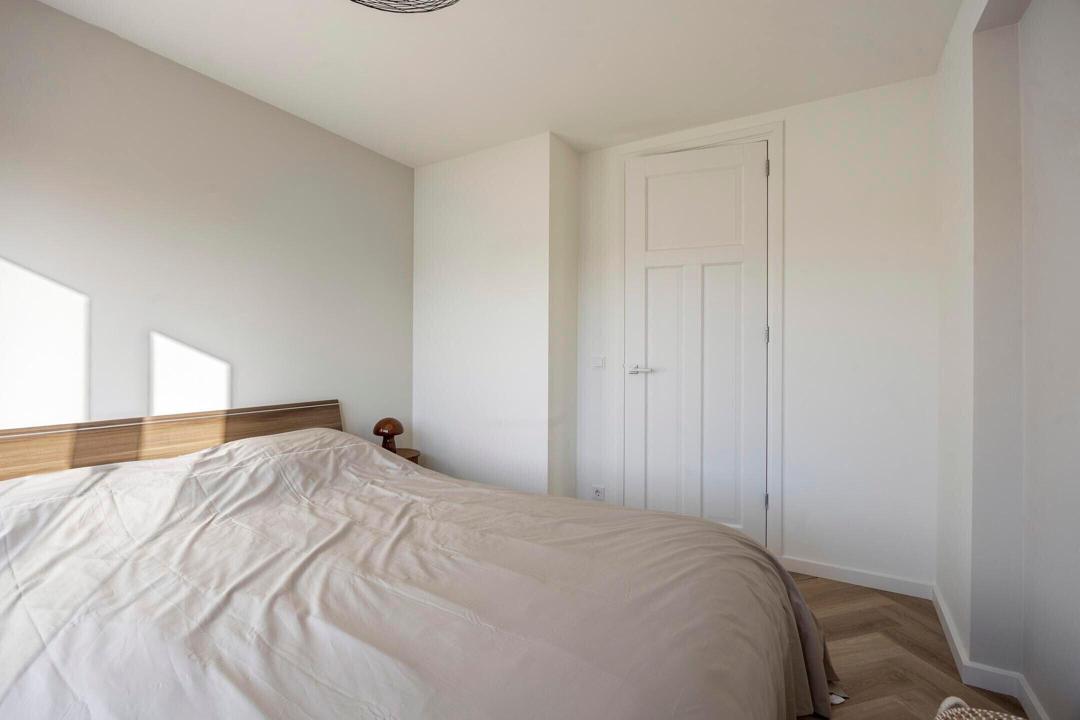 De twee slaapkamers zijn beiden ruim, licht en net als de rest van de woning strak afgewerkt met dezelfde pvc visgraat vloer. De moderne badkamer (2021) is efficiënt ingedeeld en voorzien van een luxe inloopdouche, een wastafel met verwarmde spiegel en een handdoekradiator.