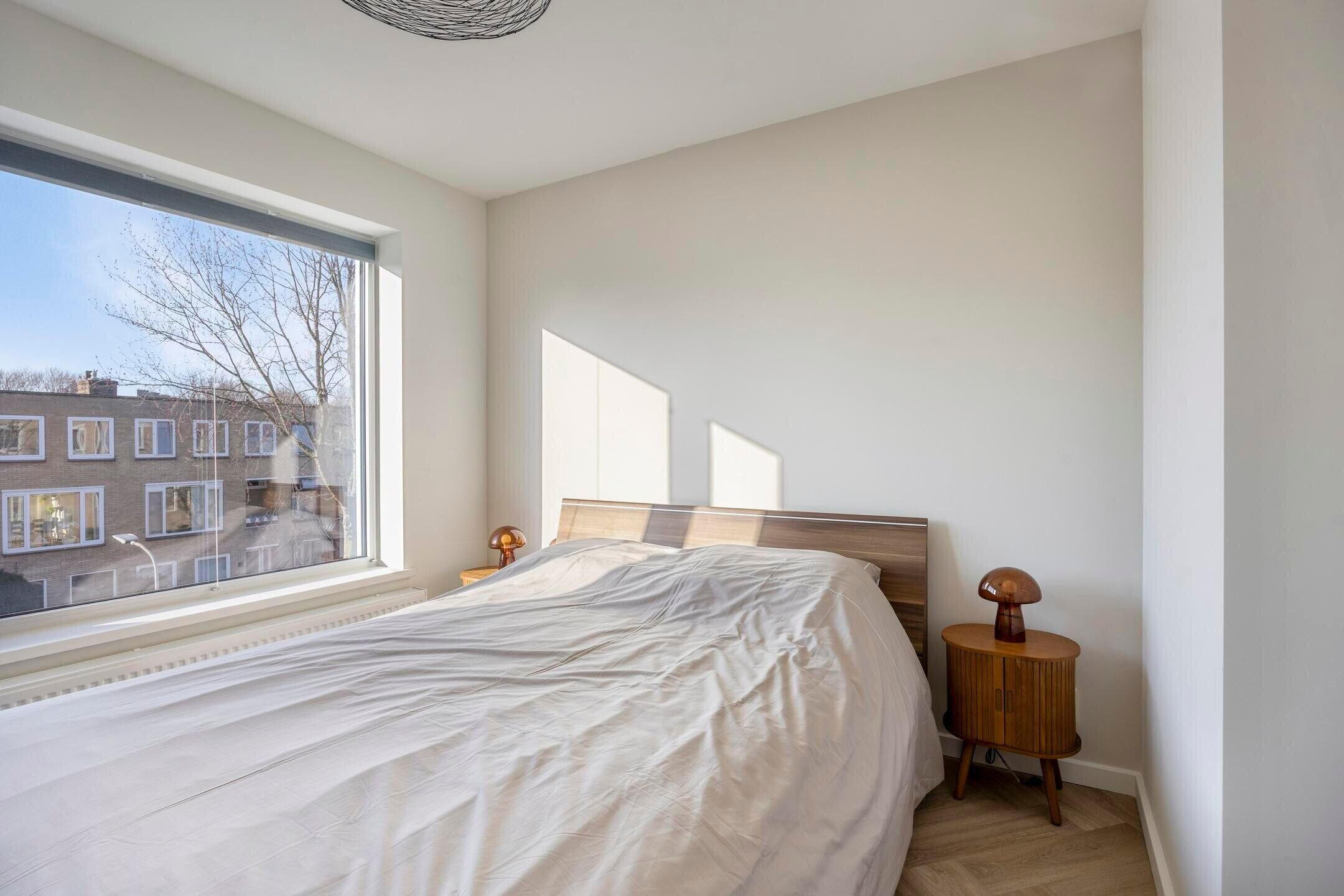 Op de hoek en tevens de bovenste verdieping van een kleinschalig complex ligt dit fantastische en compleet gerenoveerde appartement met twee slaapkamers. Dankzij de hoekligging met een extra zijraam op het zuiden, en het feit dat je op de tweede etage woont, geniet je hier van ongekend veel daglicht, rust en privacy.
